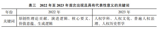 其次,由于近兩年是相關研究成果集中涌現(xiàn)的兩年,文獻數(shù)量約占總體研究成果的86%,因此,雖然研究趨勢的分析對文獻所處時間段的跨度要求較高,但是在大量研究成果集中產(chǎn)出的情況下,其同樣能夠靈敏地部分反映出研究趨勢的變化,為我們提供有價值的信息。故而,除統(tǒng)計高頻關鍵詞之外,筆者分別從2022年以及2023年的文獻關鍵詞中挑取出了首次出現(xiàn)且具有代表性意義的關鍵詞,以見微知著(具體見表三)。