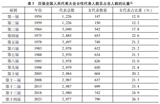 從形式上看,參與到立法過程中的女性人數(shù)就可以說明女性立法參與的程度。我國(guó)法律法規(guī)以及相關(guān)政策對(duì)保障和促進(jìn)女性參政也做出了相應(yīng)的規(guī)定。例如《選舉法》《婦女權(quán)益保障法》等規(guī)定,全國(guó)人民代表大會(huì)和地方各級(jí)人民代表大會(huì)中應(yīng)當(dāng)有適當(dāng)數(shù)量的婦女代表,并逐步提高婦女代表的比例?!兜谑粚萌珖?guó)人民代表大會(huì)代表名額和選舉問題的決定》則明確要求“第十一屆全國(guó)人民代表大會(huì)代表中,婦女代表的比例不低于22%”。而第十二屆、第十三屆、第十四屆的“決定”也都分別強(qiáng)調(diào):“婦女代表的比例應(yīng)當(dāng)高于上屆”,“婦女代表的比例要比上屆有所提高”,“婦女代表的比例原則上要高于上屆”。浙江、湖南、湖北等地方的《婦女權(quán)益保障法》實(shí)施辦法中也都規(guī)定了地方人大代表女候選人比例不低于30%的標(biāo)準(zhǔn)。如表1所示,我國(guó)全國(guó)人民代表中的女性代表比重呈現(xiàn)出緩慢增長(zhǎng)的趨勢(shì),最近一屆的比例達(dá)到了26.5%。