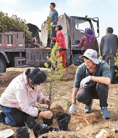 殷一凡與工人一起裝運(yùn)樹苗。白國(guó)才 攝