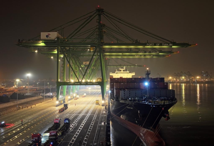 1月16日,大型集裝箱班輪“巴赫”號靠泊在天津港太平洋國際集裝箱碼頭(無人機照片)。天津港首條直通南美“車厘子快線”正式開通。