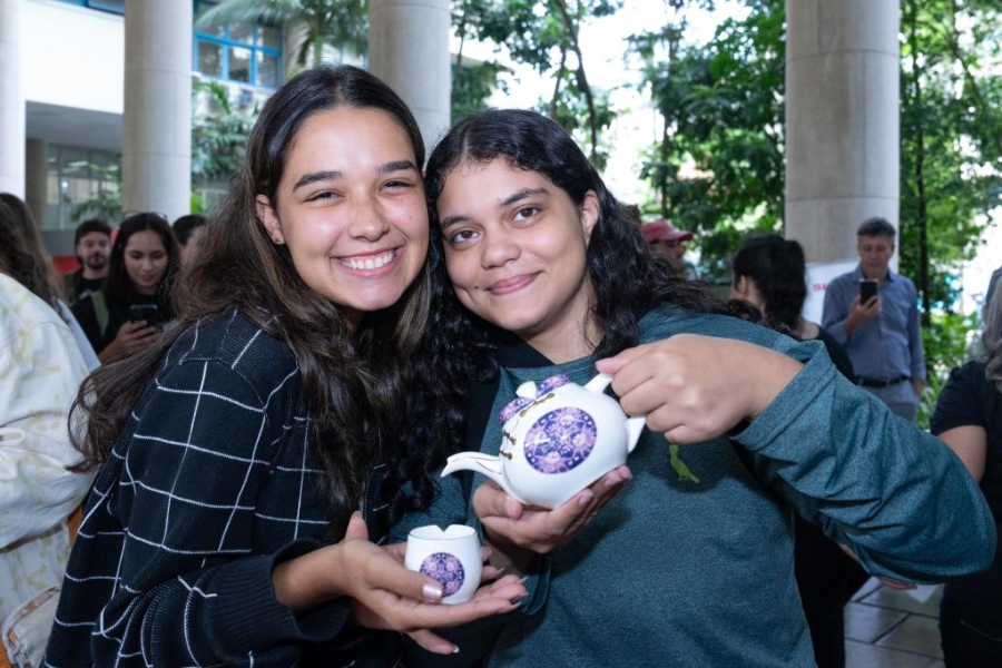 4月18日,在巴西里約熱內(nèi)盧舉行的聯(lián)合國中文日活動上,巴西學生與中國工藝品合影。