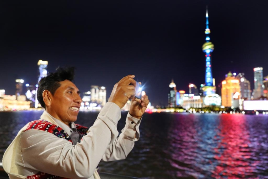 2023年11月2日,秘魯手工藝人奧斯瓦爾多·馬馬尼來中國參加第六屆進博會時,在上海外灘游覽。