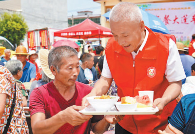 說話間,車子停在了村黨群服務(wù)中心。75名身穿紅馬甲、頭戴小紅帽的志愿者分工明確,搭戲臺(tái)、支帳篷、擺桌椅,各自忙活起來。“把午餐宣傳布這邊綁在燈柱子上,那邊系在空調(diào)架子上。義診、義剪、義修隊(duì)伍到位了沒?”人群中,宋紅昌扯開嗓子,四處張羅。