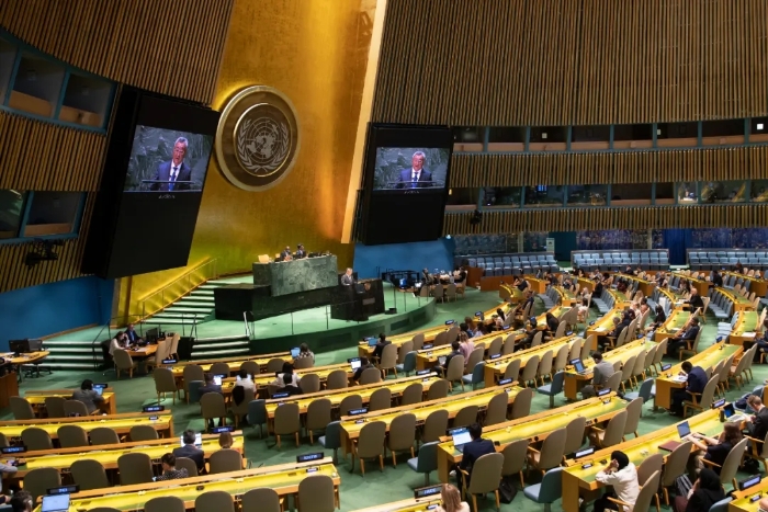 當(dāng)?shù)貢r(shí)間7月1日,在紐約聯(lián)合國(guó)總部,第78屆聯(lián)合國(guó)大會(huì)協(xié)商一致通過中國(guó)主提的加強(qiáng)人工智能能力建設(shè)國(guó)際合作決議。圖為中國(guó)常駐聯(lián)合國(guó)代表傅聰在會(huì)上介紹決議草案。中新社記者 廖攀/攝