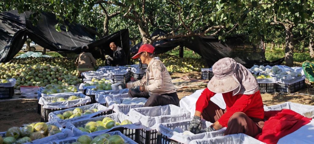 又到一年豐收時(shí)。近日,山西省臨汾市隰縣的玉露香梨迎來收獲季節(jié),沉甸甸的玉露香梨掛滿了枝頭。果農(nóng)們把玉露香梨從樹上摘下后,小心翼翼地放入筐中,分揀、包裝、裝車,果園里一派繁忙景象。