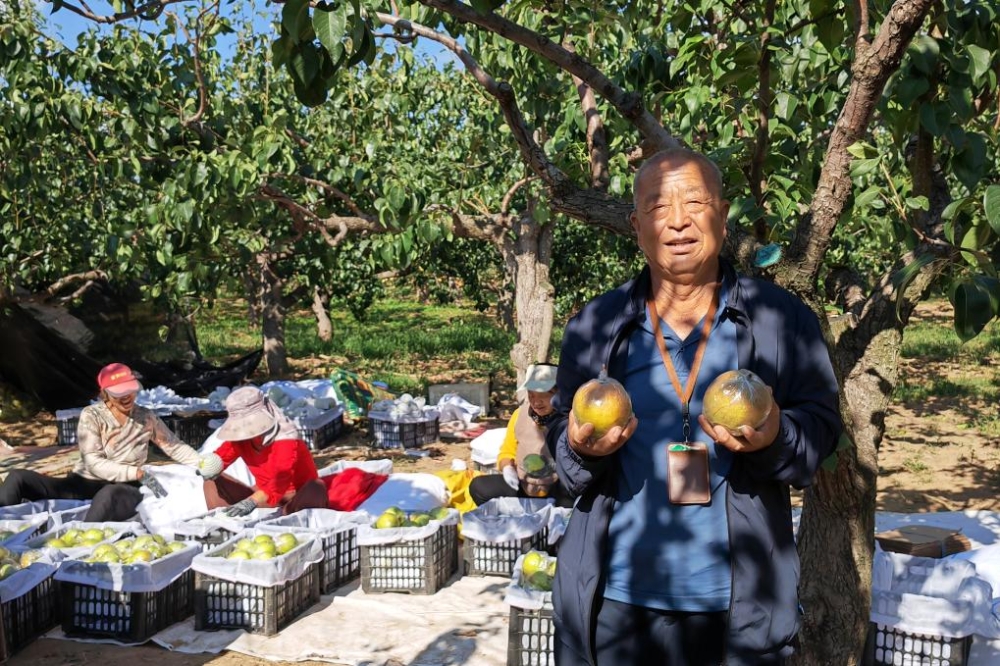 今年78歲的閆云海從20世紀(jì)80年代開始種梨,蜜梨、酥梨等品種試了個(gè)遍,最后找到梨果專家引進(jìn)了玉露香梨。“玉露香梨水分大、糖多、色美、皮薄、口感好,而且耐保存。如今我們家三代人都在種玉露香梨。”閆云海說。