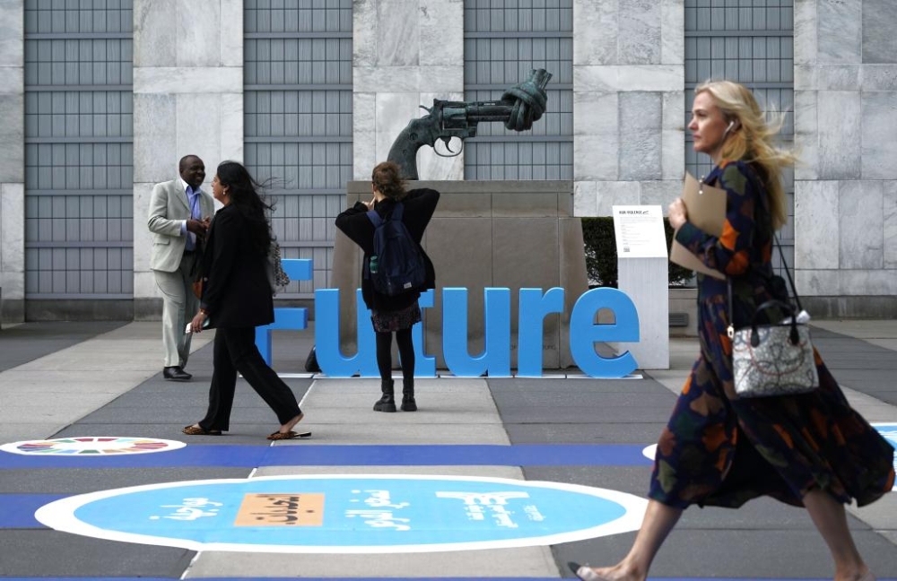 9月23日,在美國(guó)紐約,與會(huì)者從聯(lián)合國(guó)未來峰會(huì)會(huì)場(chǎng)外走過。新華社記者吳曉凌攝