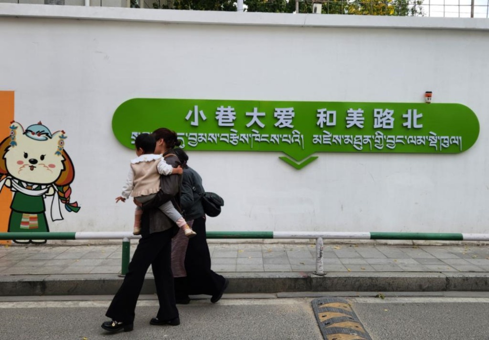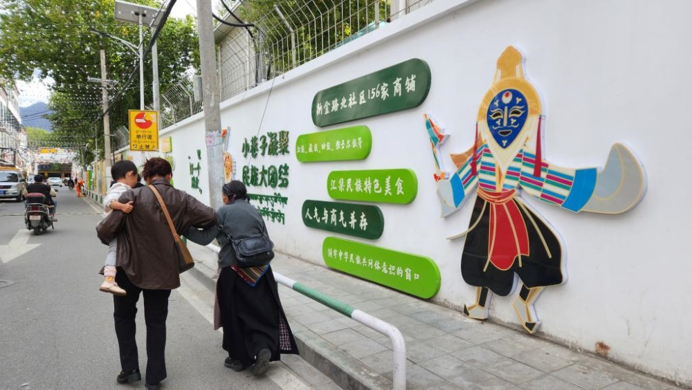 配合路政部門把洽瑪崗路改為單行道,讓街道靜下來;協(xié)同三大運(yùn)營商,把街上縱橫交錯(cuò)的“飛線”收進(jìn)沿街橋架,還行人一片藍(lán)天;對(duì)接專業(yè)設(shè)計(jì)團(tuán)隊(duì),以本地犬種拉薩阿普索犬設(shè)計(jì)社區(qū)IP形象“嘎嘎”(意為快樂),街角的墻繪、樹上的引導(dǎo)牌、商戶的門臉上都能看到這只可愛的小狗……社工旦增晉美對(duì)社區(qū)的變化如數(shù)家珍。