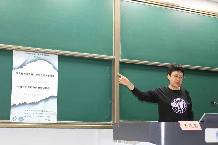 2024年11月7日,F(xiàn)DU青年法學(xué)會「法學(xué)+X」計劃第103期講座在邯鄲校區(qū)第三教學(xué)樓H3108順利舉行。講座聚焦「法學(xué)+人權(quán)」兩大重要領(lǐng)域,圍繞「婦女權(quán)利保護」這一主題,邀請到復(fù)旦大學(xué)馬克思主義學(xué)院副教授朱曉慧老師與復(fù)旦大學(xué)法學(xué)院副教授陸志安老師作為分享嘉賓,分別就「從人權(quán)視角透視婦女解放的多重維度」與「婦女權(quán)利保護當(dāng)前面臨的挑戰(zhàn)」兩個話題,為法學(xué)院學(xué)生和其他感興趣的同學(xué)帶來了一場跨學(xué)科交流盛宴。講座由青法讀書會部門成員李悠然主持。