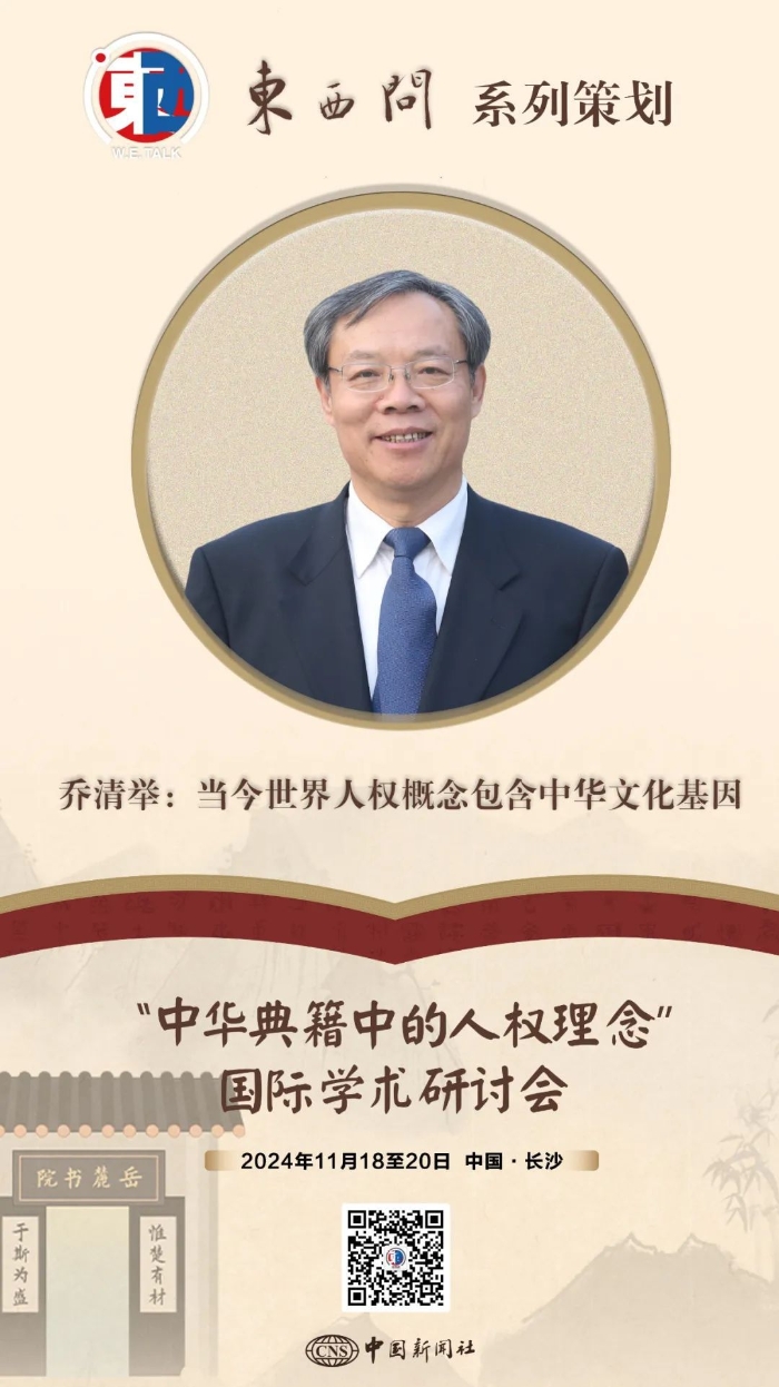“人權(quán)”這一概念雖產(chǎn)生于西方,但人權(quán)的思想并不是西方的專利。中國傳統(tǒng)文化中蘊含著大量人權(quán)觀念,與西方的人權(quán)觀念道理一致,歷史上也曾影響了世界人權(quán)概念的形成。11月18日至20日,“中華典籍中的人權(quán)理念”國際學術(shù)研討會在湖南大學岳麓書院舉行,中央黨校(國家行政學院)哲學部教授喬清舉在接受中新社“東西問”專訪時表示,當今世界的人權(quán)概念具有中華優(yōu)秀傳統(tǒng)文化色彩,包含中華文化基因,中華優(yōu)秀傳統(tǒng)文化將為世界人權(quán)思想的進一步發(fā)展提供寶貴的文化滋養(yǎng)。