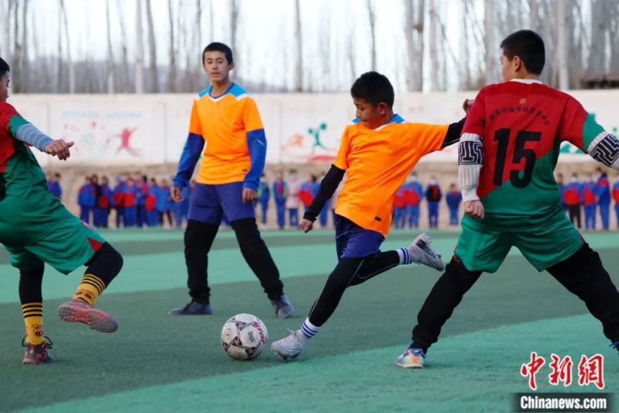 2023年12月13日,在新疆阿圖什市上阿圖什鎮(zhèn)依克薩克小學(xué),一場鄉(xiāng)村小學(xué)間的足球賽正激烈進(jìn)行。中新社記者 韓海丹 攝