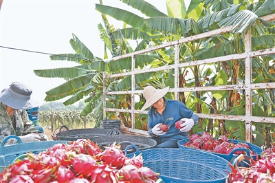 在位于老撾首都萬(wàn)象的中國(guó)—老撾合作農(nóng)作物優(yōu)良品種試驗(yàn)站,當(dāng)?shù)剞r(nóng)戶正在分揀火龍果。本報(bào)記者 楊 一攝