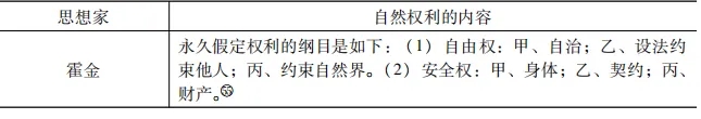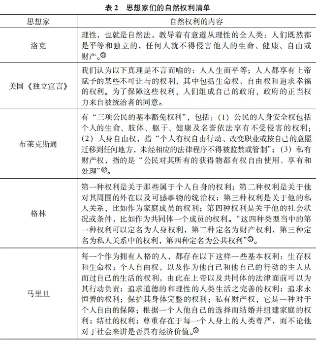 其次,人權(quán)或權(quán)利肯認(rèn)人們有保全自我、規(guī)劃生活、安排生計的權(quán)利,在此人權(quán)或權(quán)利為人們追求幸福生活提供助力。就人的幸福生活而言,它包含生存、生活、生計等基本內(nèi)容,涵蓋了一個人生老病死的整個生命歷程。正因如此,人權(quán)是生活的底色,同樣可以從人權(quán)的初始概念——自然權(quán)利——中得到證明。為了簡便起見,我們可以列出一些思想家有關(guān)自然權(quán)利的論述(見表2),來觀察其與人們幸福生活的關(guān)聯(lián):