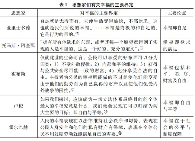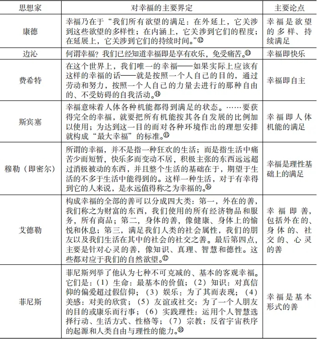 然而,在哲學(xué)層面,幸福生活雖然是歷代思想家們的研究主題,但究竟什么是幸福,其本質(zhì)特征、構(gòu)成要素及具體內(nèi)容如何,可謂觀念紛陳、異見迭出。為明晰起見,我們在此通過表1大致歸納了一些具有代表性的陳述: