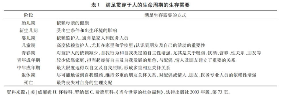 生存權(quán)的廣泛性還不只表現(xiàn)為所有國(guó)民都能從國(guó)家的幫助、扶持中獲得益處,同樣在人生的整個(gè)歷程,生存需要都普遍地、廣泛地存在著,因而生存權(quán)覆蓋于人生的整個(gè)過程。國(guó)外學(xué)者所歸納的“滿足貫穿于人的生命周期的生存需要”,很好地說明了在人生的每一個(gè)階段、生命的每一個(gè)歷程中,生存的需要都如影隨形,與每一個(gè)體須臾不可分離(具體見表1)。