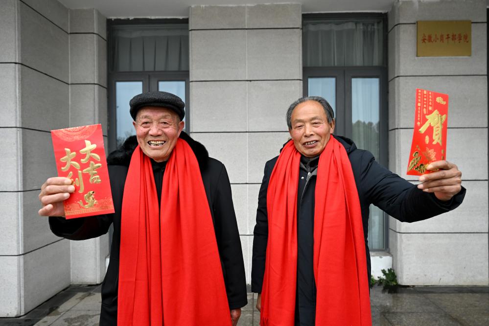 1月25日,在鳳陽縣小崗村,“大包干”帶頭人嚴金昌(左)和嚴宏昌展示自家領(lǐng)取的分紅紅包。新華社記者 黃博涵 攝