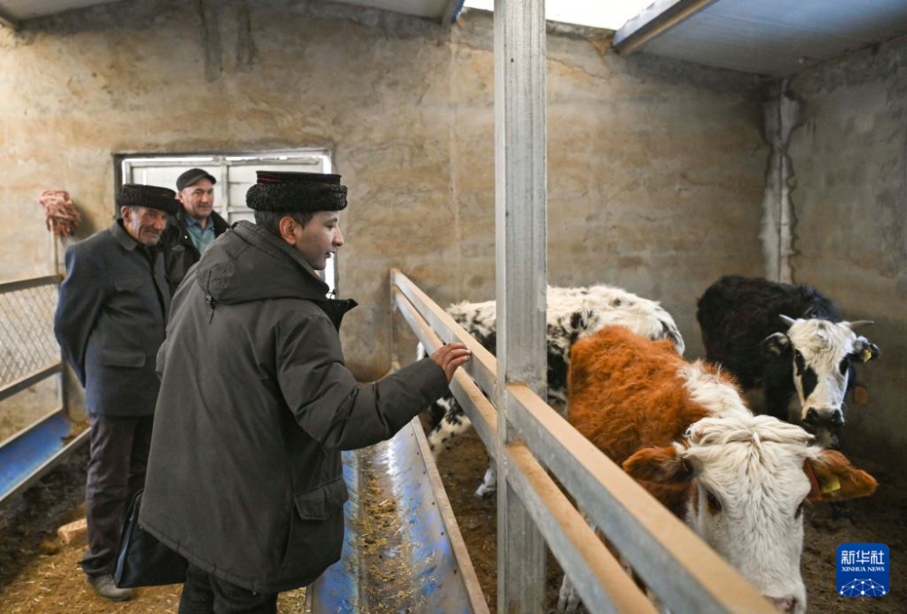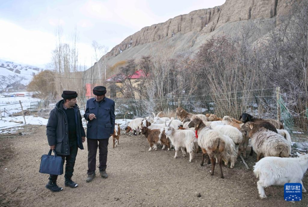 在新疆喀什地區(qū)塔什庫爾干塔吉克自治縣瓦恰鄉(xiāng)夏布孜喀拉村,多來提曼·開米克在一戶村民的棚圈中實地了解牲畜越冬情況(2025年1月3日攝)。