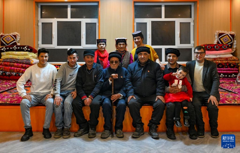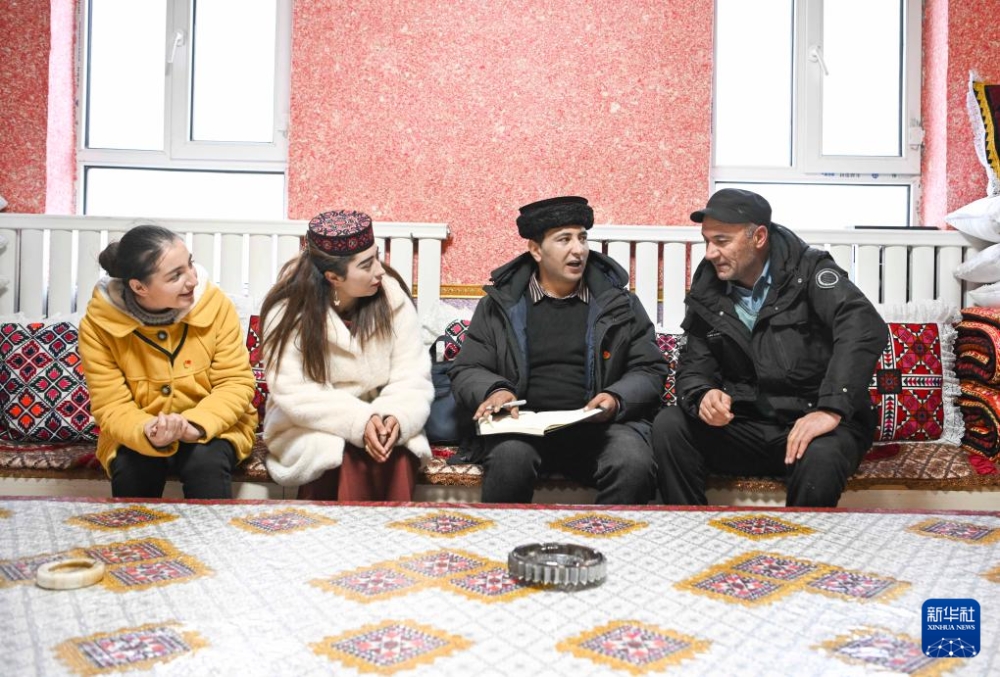 在新疆喀什地區(qū)塔什庫爾干塔吉克自治縣瓦恰鄉(xiāng)夏布孜喀拉村,多來提曼·開米克(右二)在牧家樂經(jīng)營主帕爾吾尼克·吾地那(右一)家中調(diào)研,聽取他對鄉(xiāng)村旅游發(fā)展的意見建議(2025年1月3日攝)。