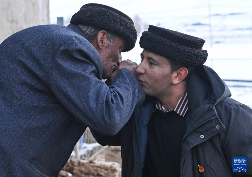 多來提曼·開米克(右)在村里走訪時,與一位長者行“吻手貼面”禮(2025年1月3日攝)。