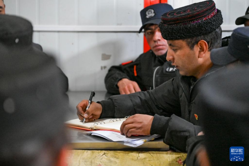 在中國-塔吉克斯坦邊境地區(qū)的一處執(zhí)勤點,多來提曼·開米克(右)與護邊員交流時記錄護邊員的反饋(2025年1月9日攝)。
