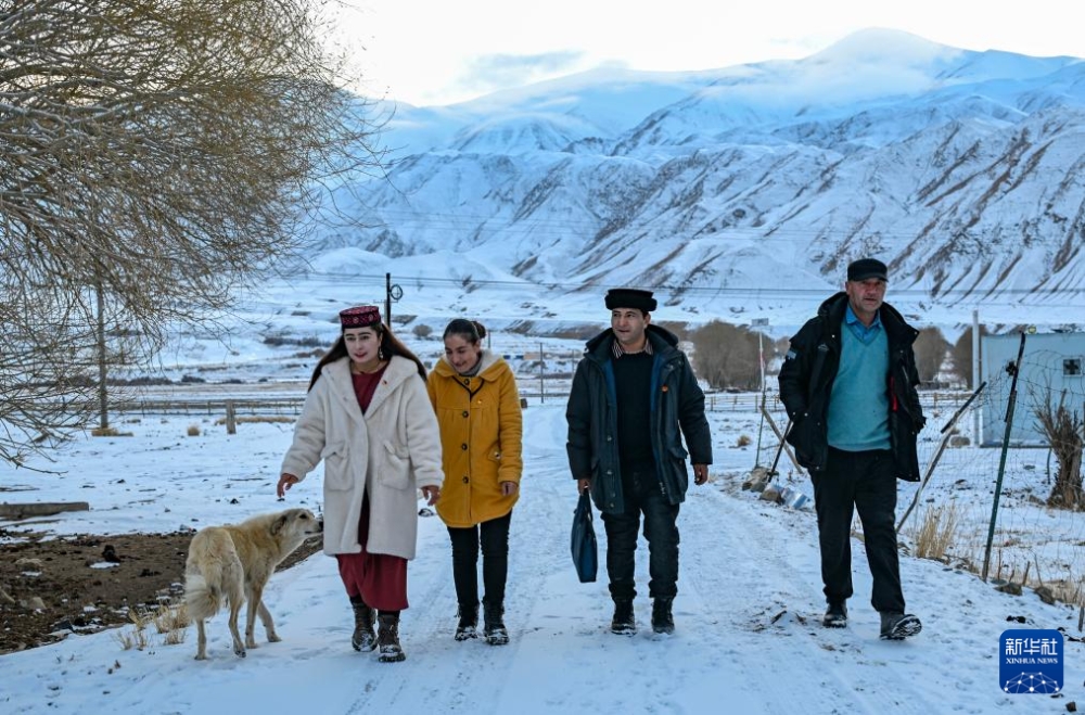 在新疆喀什地區(qū)塔什庫爾干塔吉克自治縣瓦恰鄉(xiāng)夏布孜喀拉村,多來提曼·開米克(右二)在村里走訪(2025年1月3日攝)。