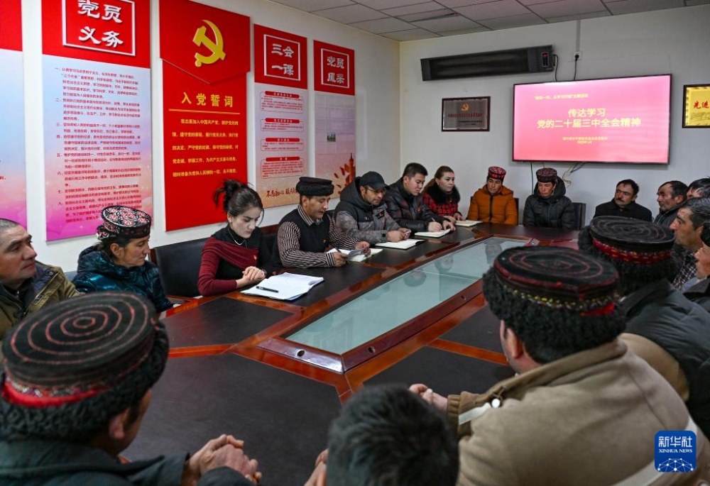 多來提曼·開米克在新疆喀什地區(qū)塔什庫爾干塔吉克自治縣瓦恰鄉(xiāng)夏拉夫迭村宣講黨的二十屆三中全會精神(2025年1月4日攝)。