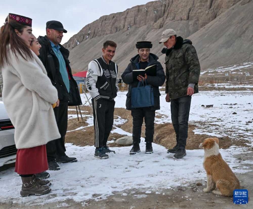 在新疆喀什地區(qū)塔什庫爾干塔吉克自治縣瓦恰鄉(xiāng)夏布孜喀拉村,多來提曼·開米克(右二)在村里走訪時與年輕村民交流(2025年1月3日攝)。