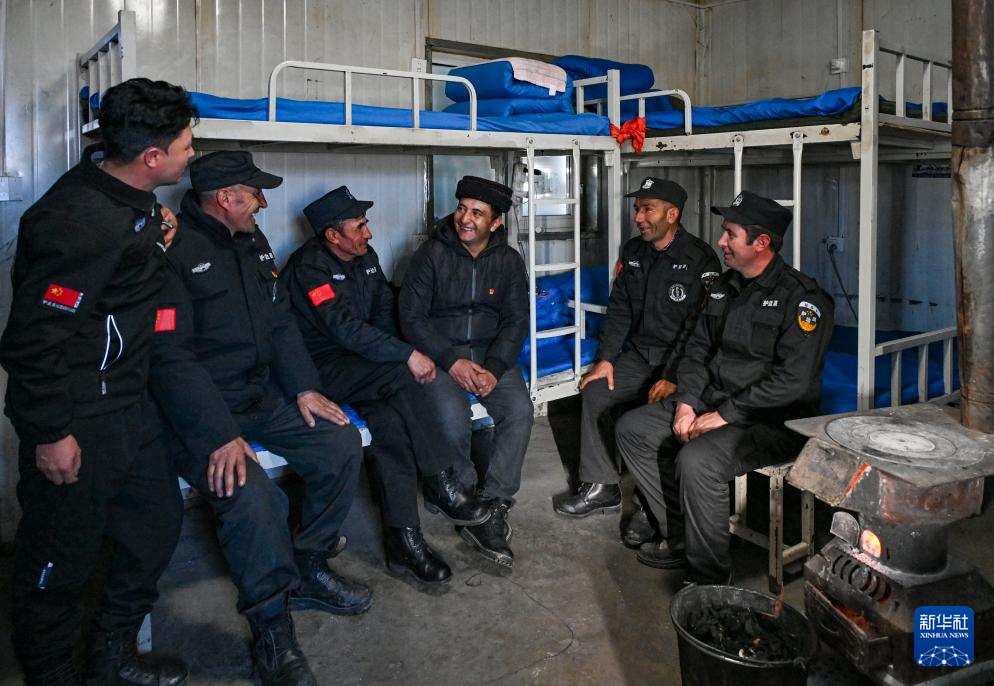 在中國-塔吉克斯坦邊境地區(qū)的一處執(zhí)勤點,多來提曼·開米克(右三)同本村護邊員交流(2025年1月9日攝)。