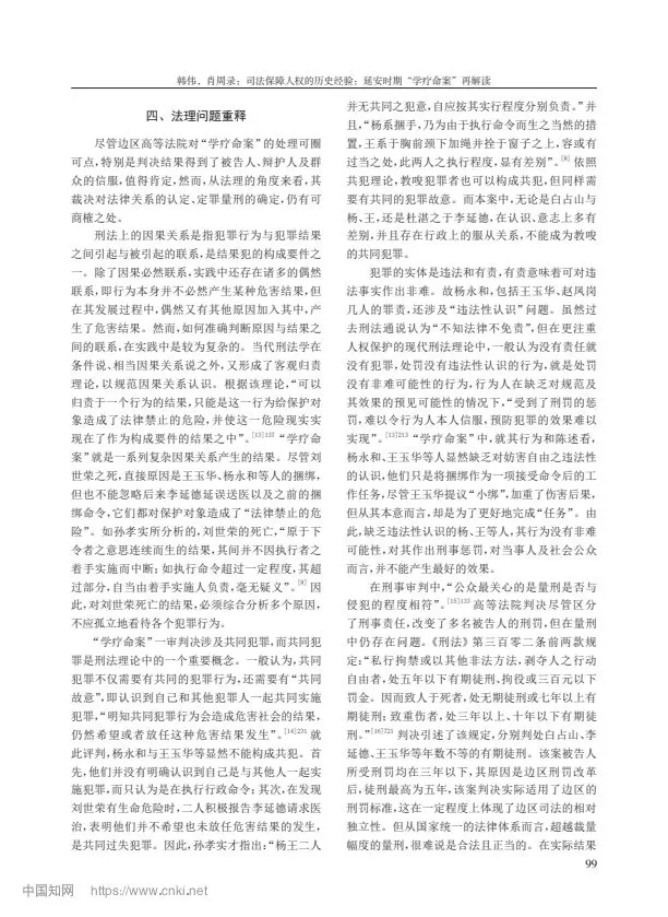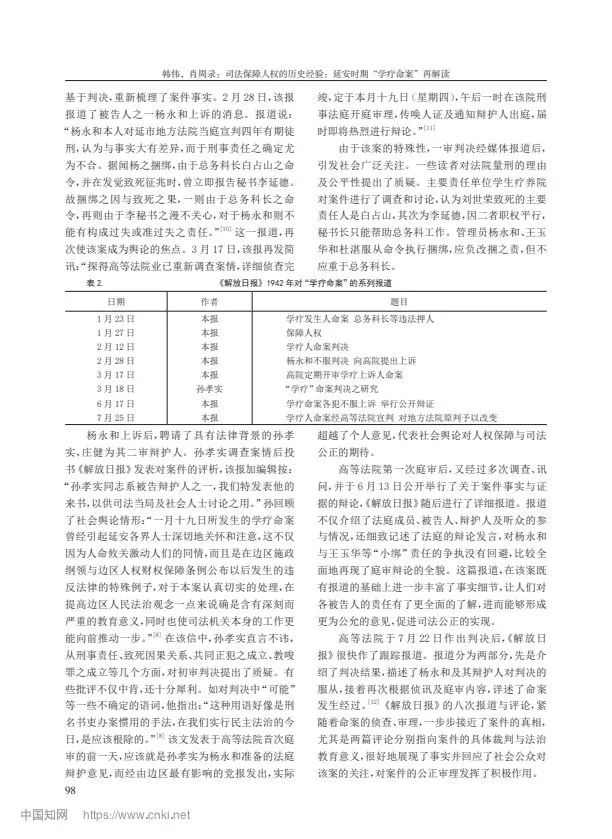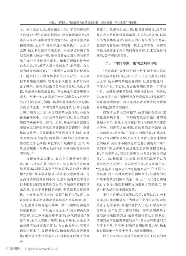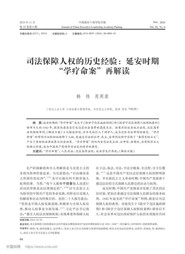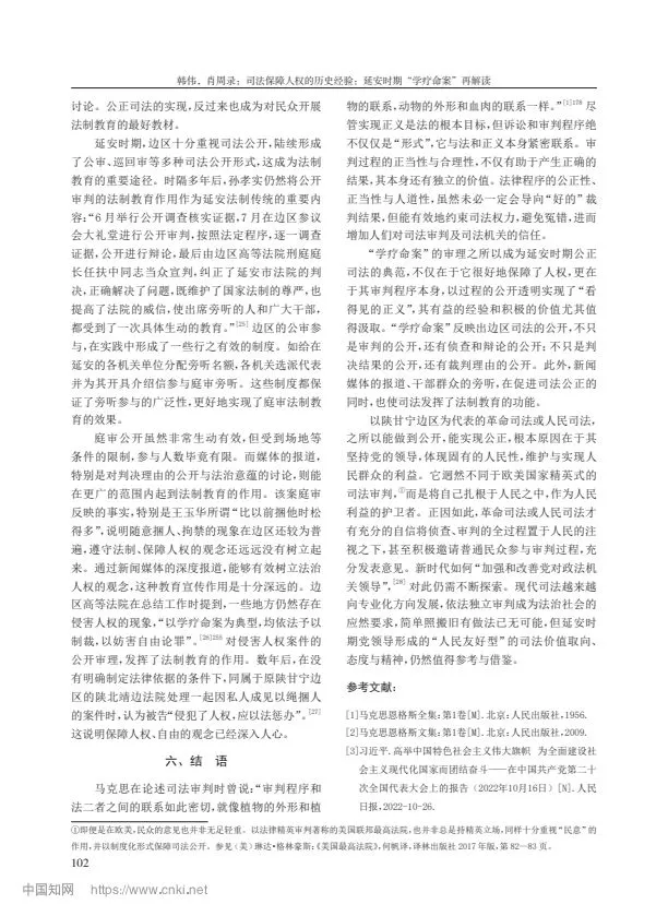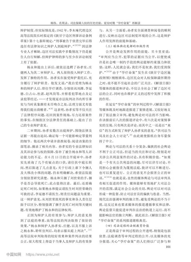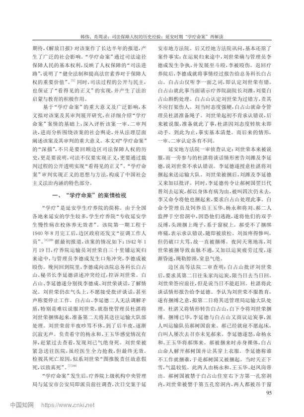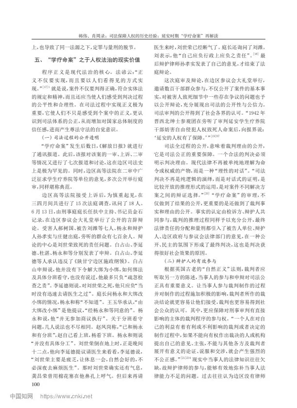摘要:延安時(shí)期的“學(xué)療命案”發(fā)生于《陜甘寧邊區(qū)施政綱領(lǐng)》和《陜甘寧邊區(qū)保障人權(quán)財(cái)權(quán)條例》頒布不久的 1942 年,因其性質(zhì)惡劣引發(fā)邊區(qū)社會(huì)各界的高度關(guān)注。該案歷經(jīng)延安地方法院、邊區(qū)高等法院兩級(jí)審判,《解放日?qǐng)?bào)》8 次報(bào)道評(píng)論,并罕見(jiàn)地引入了辯護(hù)人,成為邊區(qū)司法審判的典范。“學(xué)療命案”的審判不僅較好地保障了人權(quán),更通過(guò)司法的公開(kāi)、民主,在審判過(guò)程中實(shí)現(xiàn)了“看得見(jiàn)的正義”,產(chǎn)生了很好的法律效果與社會(huì)效果。“學(xué)療命案”判例內(nèi)含司法民主性、公開(kāi)性、協(xié)商性,具有程序正義的獨(dú)立價(jià)值,成為中國(guó)共產(chǎn)黨領(lǐng)導(dǎo)司法走向進(jìn)步的典范。