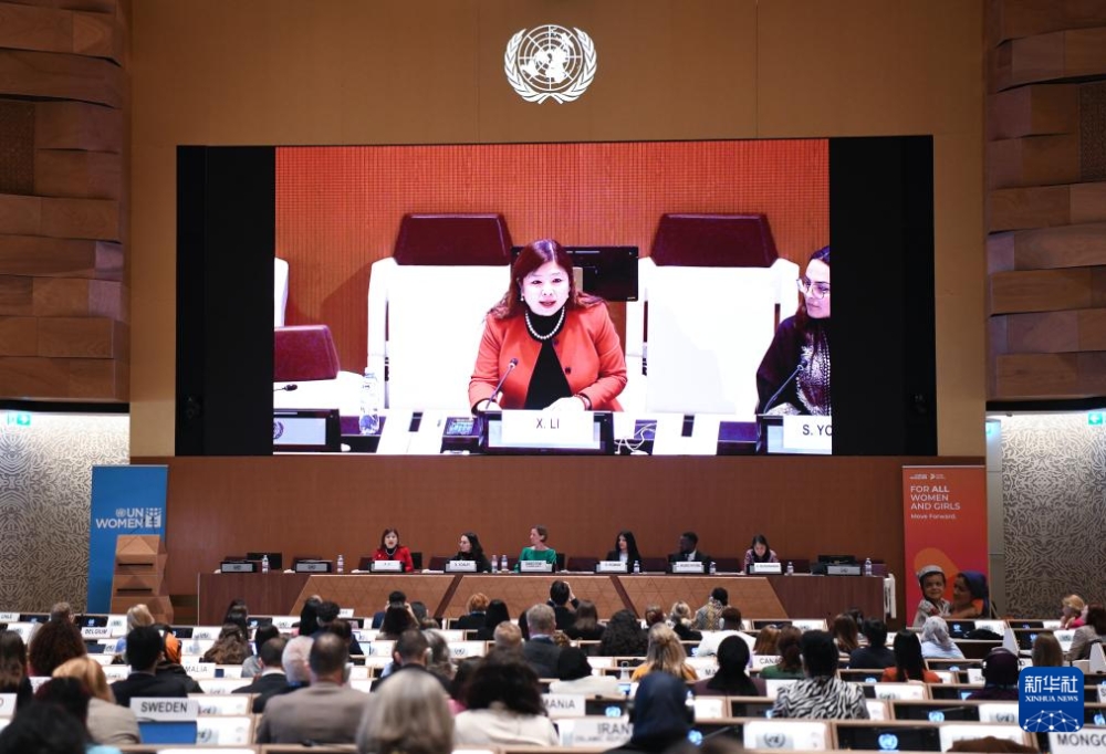3月7日,在瑞士日內(nèi)瓦萬國宮,中國代表在聯(lián)合國國際勞動婦女節(jié)紀念活動暨北京世界婦女大會三十周年對話會上講話。新華社記者 連漪 攝