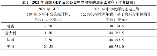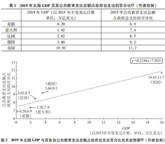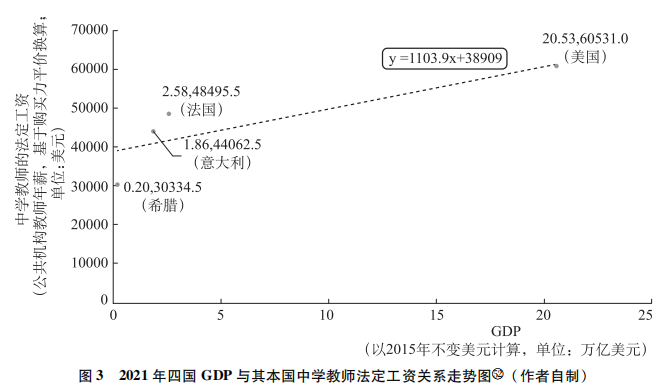 通過橫向代內(nèi)比較,同一時(shí)期不同國(guó)家的經(jīng)濟(jì)發(fā)展程度也深刻地影響了該國(guó)的人權(quán)保護(hù)水平。以受教育權(quán)為例,通過隨機(jī)抽取希臘、意大利、法國(guó)、德國(guó)、美國(guó)五國(guó)作為樣本觀測(cè)對(duì)象進(jìn)行回歸分析可以發(fā)現(xiàn),不同國(guó)家對(duì)教育系統(tǒng)的投入(如財(cái)政資金撥款、教師法定工資的平均標(biāo)準(zhǔn)等)存在巨大差異,且與各國(guó)的經(jīng)濟(jì)發(fā)展水平(以GDP指數(shù)為參考)呈顯著正相關(guān)(k>0)。具體參數(shù)及回歸方程如表1、表2,圖2、圖3所示。