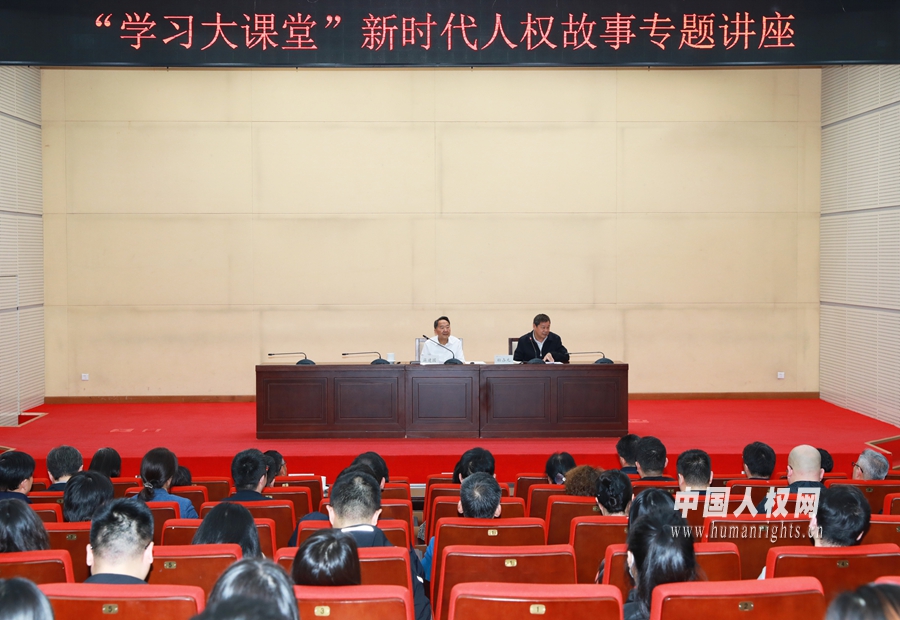 4月16日,中國人權研究會常務副會長蔣建國應邀出席中國外文出版發(fā)行事業(yè)局“學習大課堂”,圍繞講好新時代中國人權故事作專題講座。中國外文局局長杜占元主持。外文局機關、各直屬單位約150人參加活動。