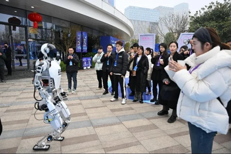 2025年3月19日, “開啟大模型•遇見機器人”——四川省人工智能產業(yè)鏈產品發(fā)布會在成都舉行,人形機器人吸引參觀者。中新社記者 張浪 攝