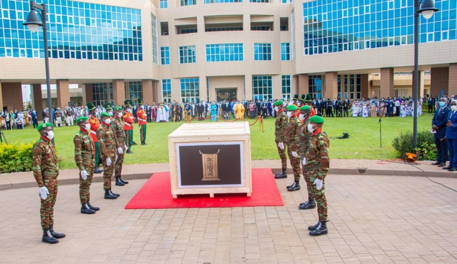 2021年11月10日,人們在貝寧科托努總統(tǒng)府參加歸還歷史文物慶?;顒?。新華社發(fā)(貝寧總統(tǒng)府供圖)