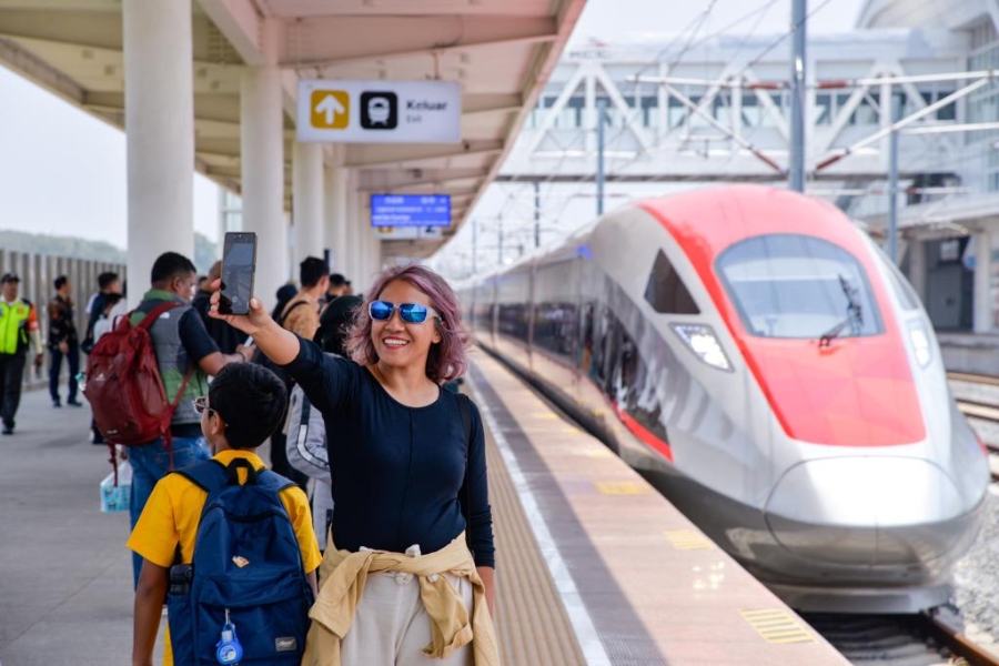 2024年10月17日,在印度尼西亞帕達(dá)拉朗站,乘客在雅萬高鐵高速動車組前自拍。新華社記者徐欽攝