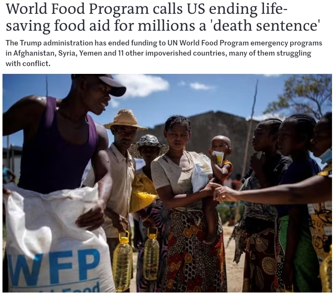 世界糧食計劃署警告說,美國中斷緊急糧食援助相當于是對千百萬面臨極端饑餓的民眾“判處死刑”。