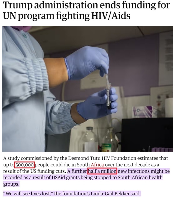 南非德斯蒙德·圖圖艾滋病中心主任琳達-蓋爾·貝克爾告訴記者,美國取消對當?shù)乜拱M織的資助將導致“超過50萬不必要的死亡以及多達50萬新增感染病例”,使有關方面“過去25年的所有努力付諸東流”。