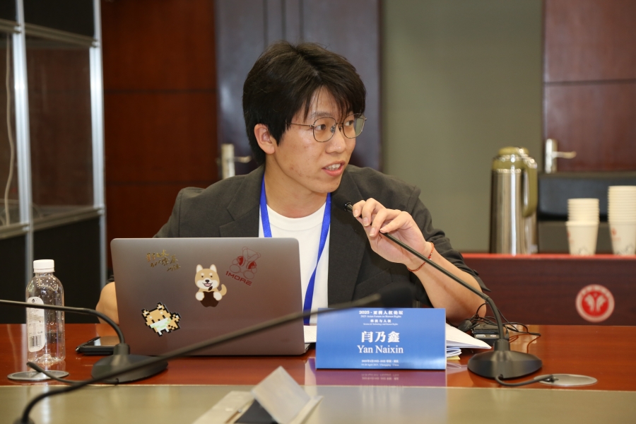 圖為西南政法大學(xué)人權(quán)研究院博士研究生閆乃鑫作題為《論數(shù)字人權(quán)作為話語(yǔ)的整合構(gòu)想》的發(fā)言。圖片來(lái)源:西南政法大學(xué)人權(quán)研究院