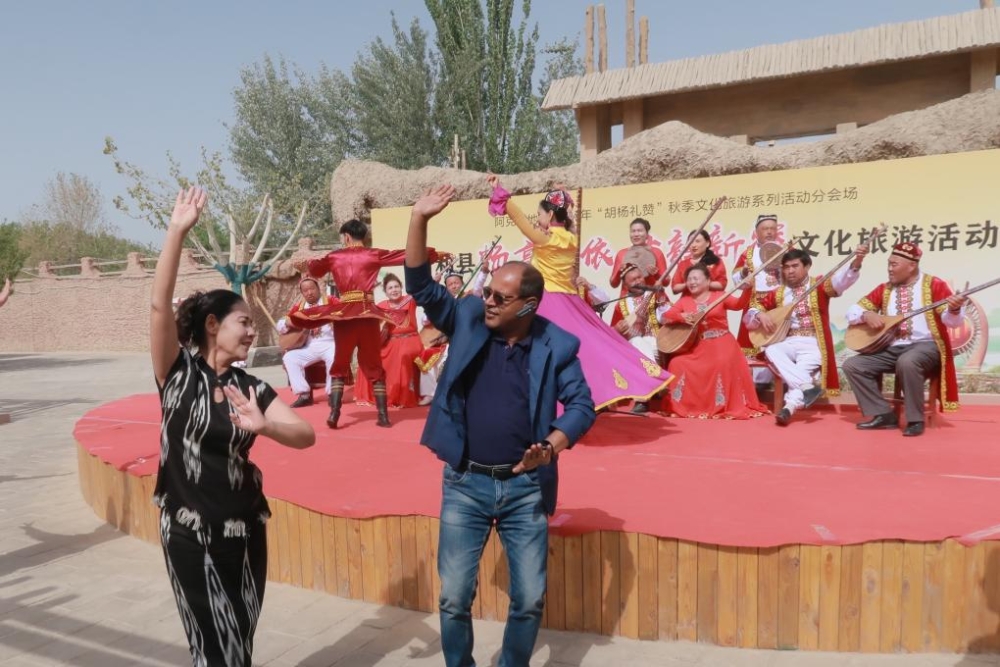 4月26日,外賓在參觀阿克蘇地區(qū)新和縣依其艾日克鎮(zhèn)加依村時,同表演人員跳舞互動。新華社記者 時藝菲 攝