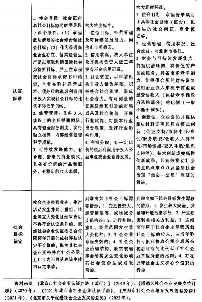 社會企業(yè)在我國經(jīng)歷了從純概念到非官方認(rèn)證再到被地方政府納入政策范圍的發(fā)展階段。社會企業(yè)認(rèn)定脫胎于2015-2019年中國公益慈善項(xiàng)目交流展示會(China Charity Fair,CCF)社會企業(yè)認(rèn)定,也是中國第一個民間性、行業(yè)性的社會企業(yè)認(rèn)定辦法。具體認(rèn)定執(zhí)行工作由社會企業(yè)認(rèn)定平臺(CSECC)負(fù)責(zé)。2020年,CSECC聯(lián)合其他專業(yè)機(jī)構(gòu)針對其在執(zhí)行行業(yè)與地方社企認(rèn)定所實(shí)施的《中國社會企業(yè)行業(yè)認(rèn)定標(biāo)準(zhǔn)體系》《地方社企認(rèn)定體系》標(biāo)準(zhǔn)進(jìn)行實(shí)踐分析與研究,并推出了社會企業(yè)認(rèn)定的四維標(biāo)準(zhǔn)。此后,佛山市順德區(qū)、北京市、成都市等地方的政府先后出臺了各自管轄范圍內(nèi)培育和扶持社企發(fā)展的政策。本文在梳理以上三地相關(guān)政策文本的基礎(chǔ)上,從社企定義、組織類型及范圍、認(rèn)證標(biāo)準(zhǔn)、社會目標(biāo)錨定四大方面進(jìn)行對比分析和提煉總結(jié)。具體對比內(nèi)容如表1所示。