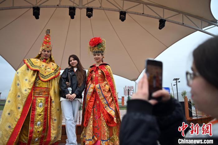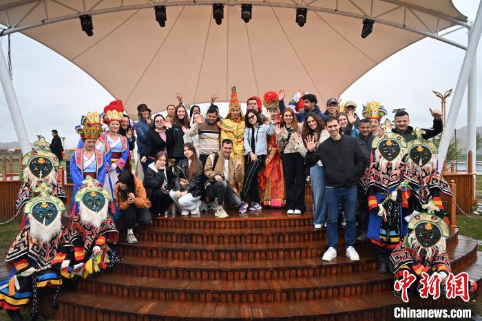 6月9日,甘肅甘南藏族自治州夏河縣,中外嘉賓與當(dāng)?shù)孛褡逦璧副硌菡吆嫌傲裟?。中新?/span>記者 九美旦增 攝