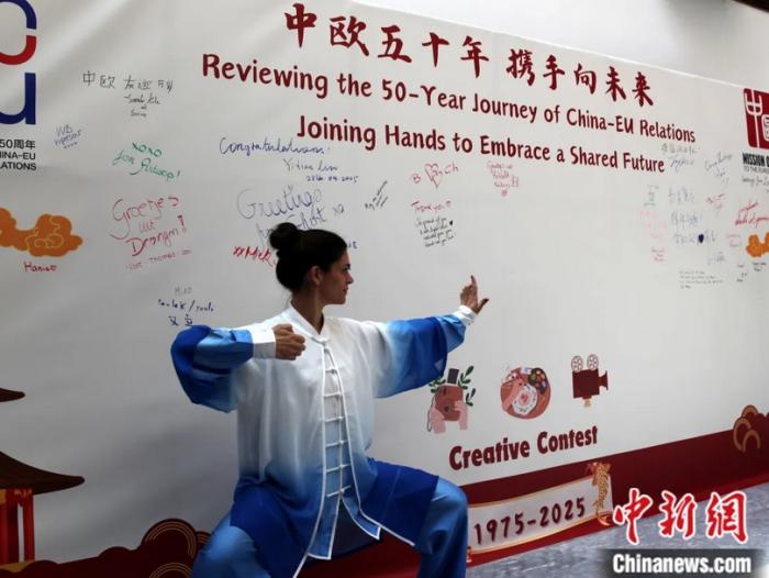 當(dāng)?shù)貢r間2025年4月28日,中國駐歐盟使團(tuán)在比利時布魯塞爾舉行“中歐五十年 攜手向未來”主題創(chuàng)意大賽頒獎儀式。圖為一名來賓擺出功夫造型,在頒獎會場留念。 中新社記者 德永健 攝