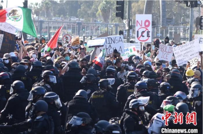 當(dāng)?shù)貢r間2025年6月8日,美國加利福尼亞州洛杉磯市中心爆發(fā)反搜捕非法移民行動抗議示威,抗議者與警方發(fā)生沖突。中新社記者 張朔 攝