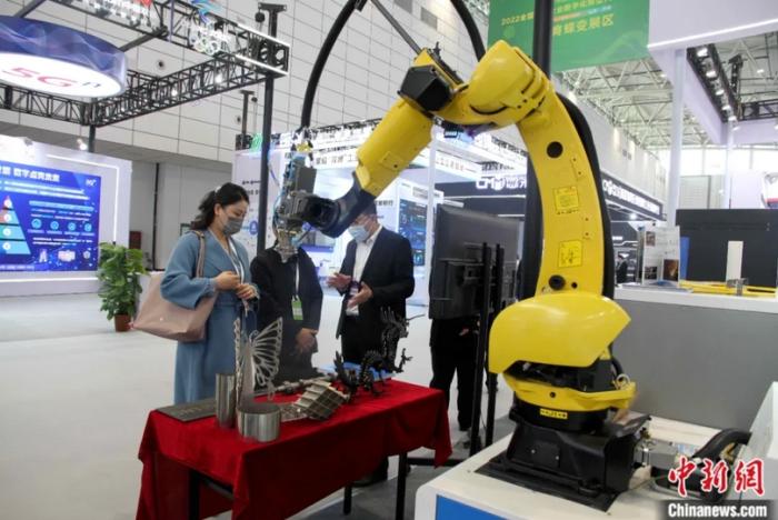 2022年11月9日,山東濟(jì)南,機(jī)器人亮相2022全國(guó)中小企業(yè)數(shù)字化轉(zhuǎn)型大會(huì)創(chuàng)新成果展。中新社記者 孫婷婷 攝