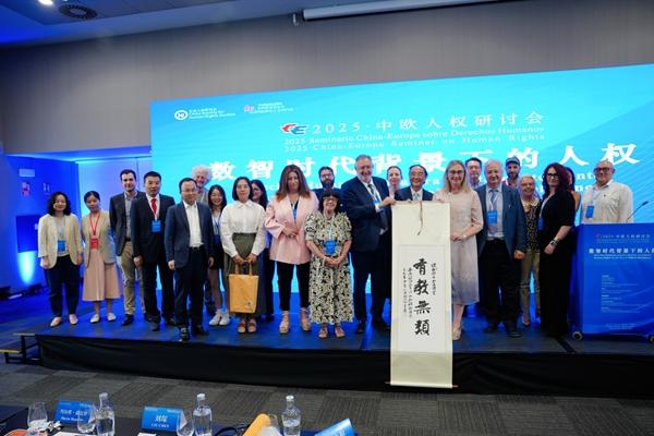 6月25日,“2025·中歐人權(quán)研討會(huì)”在西班牙首都馬德里舉行。會(huì)后,與會(huì)中歐代表展示“有教無(wú)類(lèi)”的書(shū)法作品。