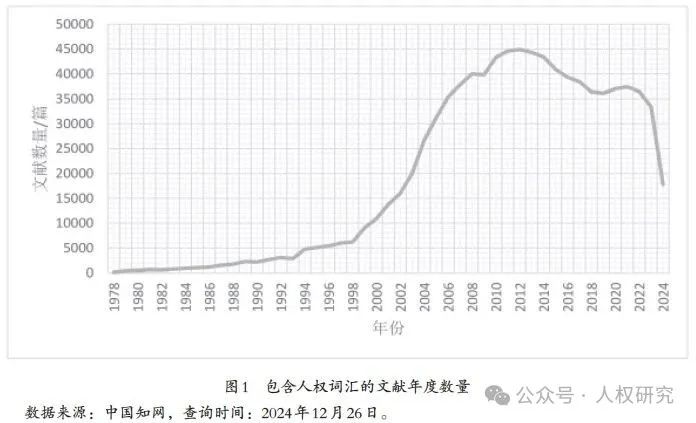 根據(jù)中國知網(wǎng)的數(shù)據(jù),在1978—2024年間,中國包含“人權(quán)”字樣的文獻(xiàn)在年度數(shù)量上呈現(xiàn)出一個倒U曲線的走勢。(見圖1)