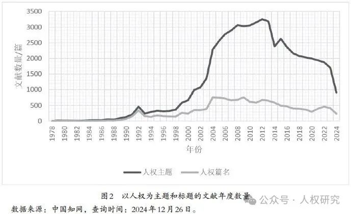 由圖1和圖2可見,包含“人權(quán)”字樣、以“人權(quán)”為主題或標(biāo)題的文獻(xiàn)數(shù)量,大體經(jīng)歷了三浪上升過程。第一波啟動上升以1978年改革開放為起點,第二波大幅上升以1991年首部人權(quán)白皮書發(fā)布為起點,第三波加速上升以2004年人權(quán)表述入憲為起點。上升的高點出現(xiàn)在2012年左右,此后相關(guān)的文獻(xiàn)數(shù)量便呈現(xiàn)逐波下降的走勢。