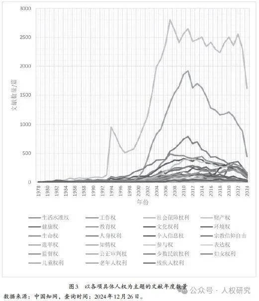 對人權(quán)相關(guān)文獻(xiàn)數(shù)量的倒U形走勢,學(xué)界大致有三種解釋。第一種解釋認(rèn)為,在改革開放開啟的人權(quán)新啟蒙階段,研究的關(guān)注點集中于“人權(quán)”的整體性概念。但隨著人權(quán)研究和實踐的不斷深入,有關(guān)人權(quán)的研究更多聚焦于具體的人權(quán)概念,由此導(dǎo)致包含“人權(quán)”字樣的文獻(xiàn)和以“人權(quán)”為主題或標(biāo)題的文獻(xiàn)數(shù)量相對減少。為了驗證這一解釋,本研究以《國家人權(quán)行動計劃(2021—2025年)》所列出的具體人權(quán)為線索,在知網(wǎng)上對以各項具體人權(quán)為主題的文獻(xiàn)的年度數(shù)量進(jìn)行查詢。查詢結(jié)果顯示,隨著人權(quán)研究和人權(quán)實踐的不斷深入,對各項具體權(quán)利的研究逐漸受到更多重視。這說明上述解釋的確提出了一個重要的影響因素。但從以各項具體人權(quán)為主題的文獻(xiàn)數(shù)量的總體走勢來看,這一因素并沒有改變整體的趨勢。(見圖3)