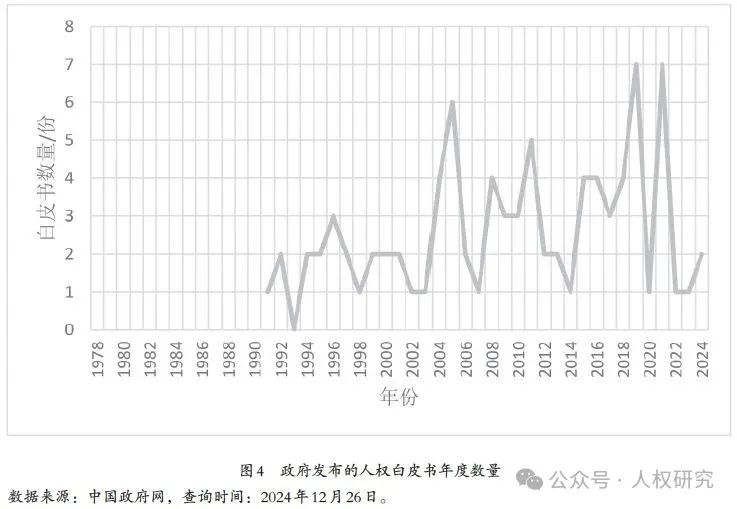 第二種解釋認(rèn)為,相關(guān)文獻(xiàn)數(shù)量的走勢是由于對人權(quán)的政治意愿的表達(dá)和宣傳還不夠充分。針對這種解釋,我們也對政府在這一時期發(fā)布的人權(quán)白皮書進(jìn)行了統(tǒng)計。(見圖4)