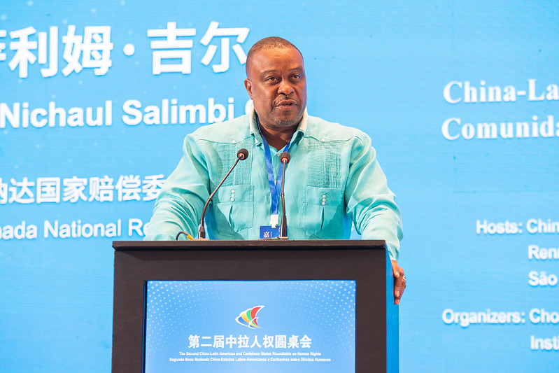 “第二屆中拉人權(quán)圓桌會(huì)”25日在巴西圣保羅舉辦。圖為格林納達(dá)國家賠償委員會(huì)主席阿利·尼紹爾·薩利姆·吉爾在開幕式上致辭。主辦方供圖